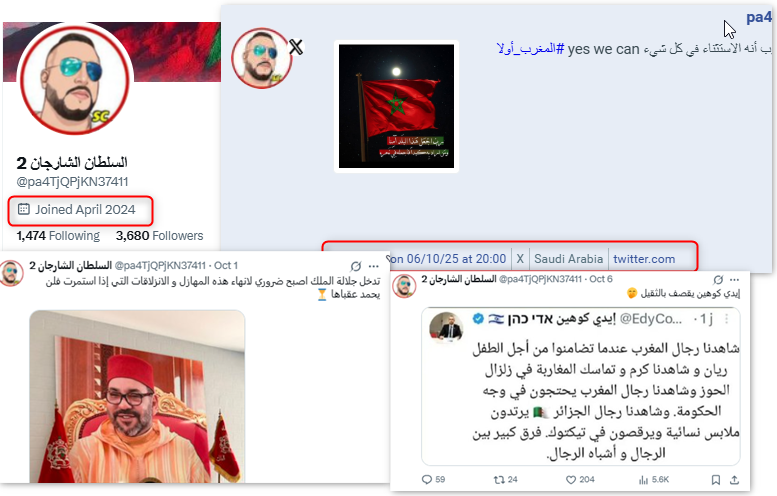 أما حساب "السلطان الشارجان 2"، فهو حساب مغربي حديث أُنشئ عام 2024 ويُدار من السعودية. وقد تركز نشاطه على تأييد الملك المغربي والتفاعل المستمر مع التغريدات المؤيدة للنظام الحاكم في المغرب، إلى جانب المحتوى المعادي للجزائر.