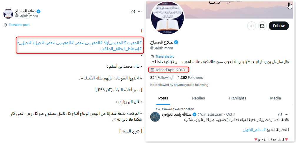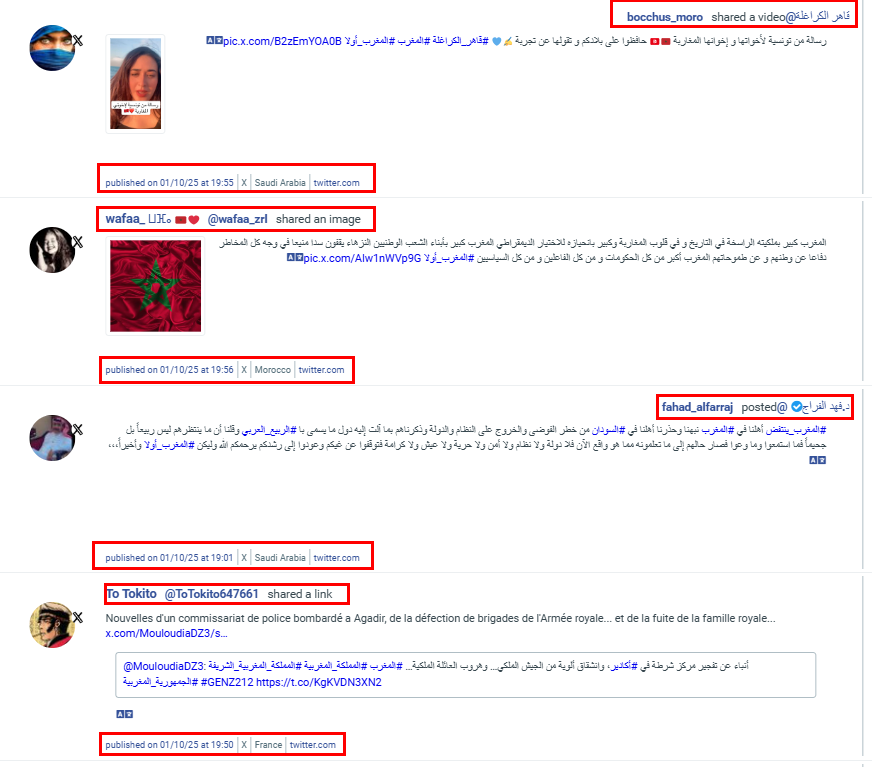 ويبرز إلى جانبها اسم مستخدم حساب "اللوبي المخزني"، وكذلك حساب @fahadddd83 "فهد (إخوان مريم)"، وكلاهما من أكثر الحسابات تفاعلاً مع هذه الوسوم وترويجاً للمضامين المؤيدة للنظام المغربي.