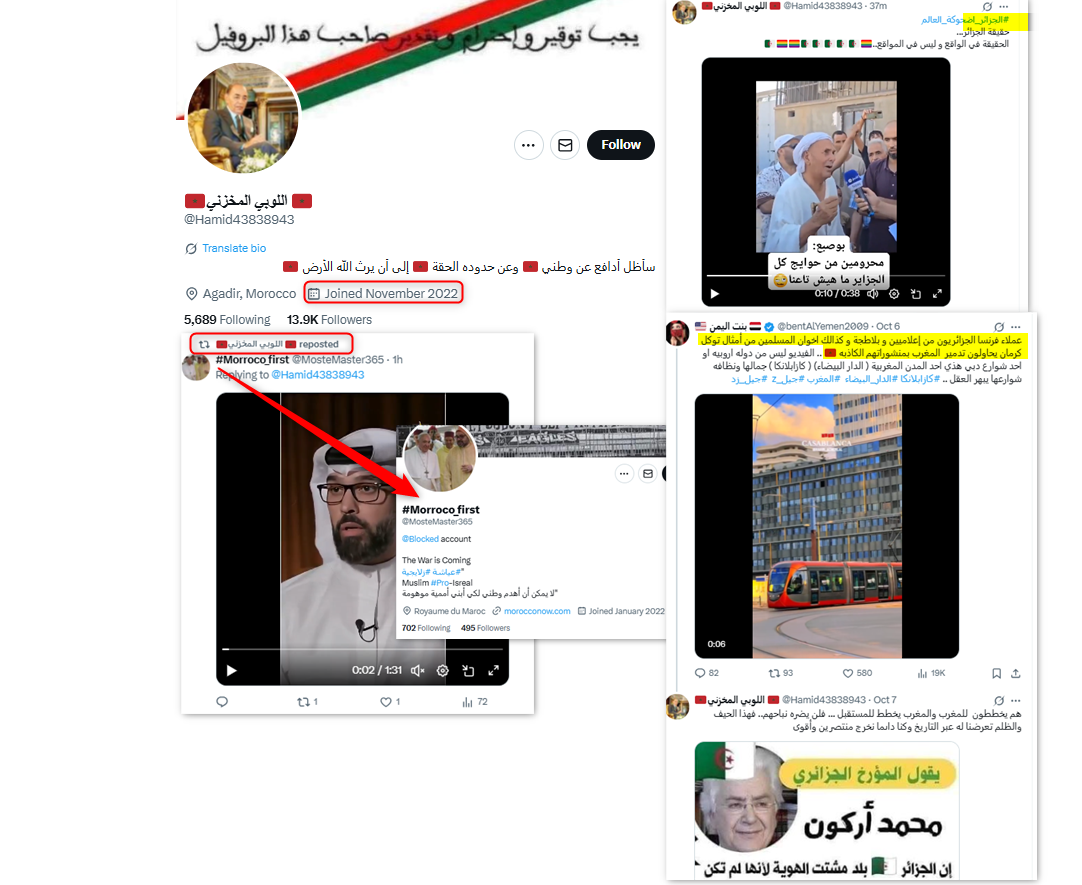 وقد أُشير إلى هذا الحساب في تقرير سابق لمجتمع التحقق العربي تناول الحرب الإلكترونية بين الجزائر والمغرب، إذ تبين استخدامه خطاب كراهية ضد الجزائريين، وخلال الأحداث الأخيرة تبنى خطاباً تحريضياً تضمن السب والقذف بحق المحتجين.