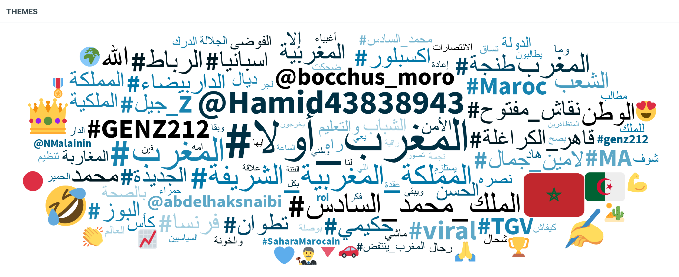 كما برزت وسوم مثل #قاهر_الكراغلة، التي تعكس حضور الجزائر بوصفها المتهم الأول في التآمر على المغرب ضمن الخطاب المتداول. ويظهر كلٌّ من حساب "قاهر الكراغلة" وحساب "اللوبي المخزني" -اللذين تم تناولُهما سابقاً- بين أكثر الحسابات تفاعلاً مع هذه الوسوم، وكذلك بين أبرز الحسابات المروّجة للسردية المؤيدة للنظام الحاكم في المغرب، والتي تتهم المحتجين بـالتآمر وإثارة الفوضى والتخريب.