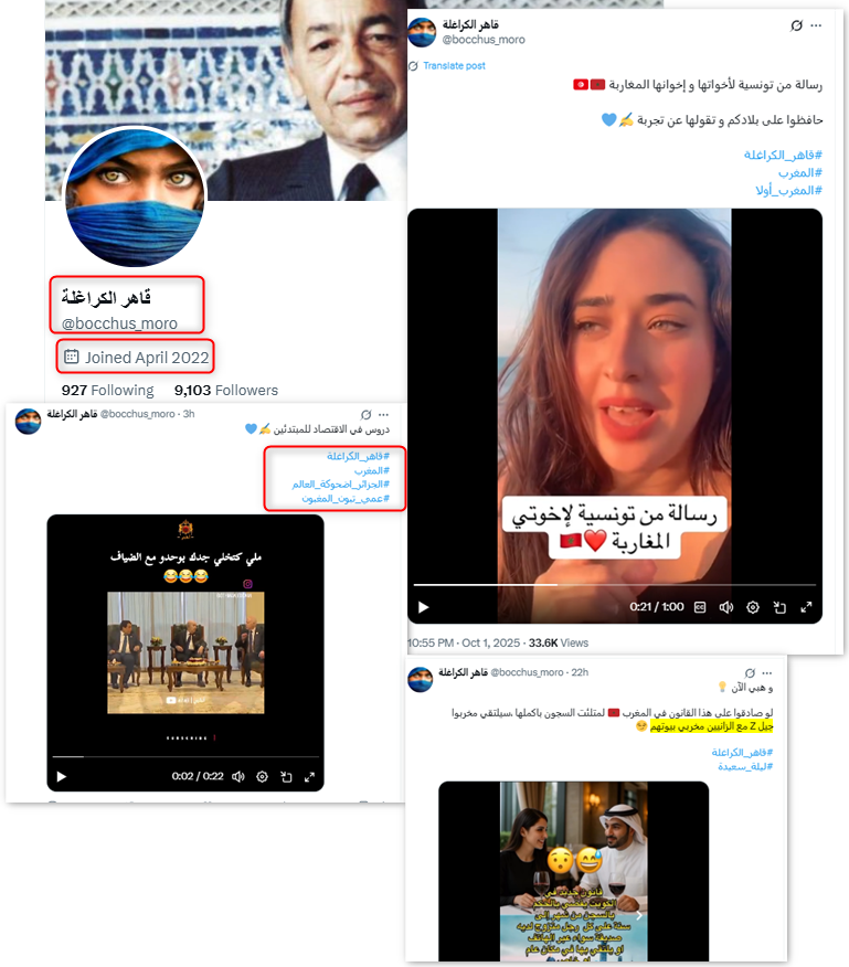 ورغم أن حساب "قاهر الكراغلة" يبدو للوهلة الأولى حساباً مغربياً، فإن تحليل نشاطه أظهر أنه يُدار من السعودية. نشر الحساب نحو 60 منشوراً ركّزت على تأييد النظام الحاكم في المغرب، إلى جانب مهاجمة الجزائر والسخرية منها.