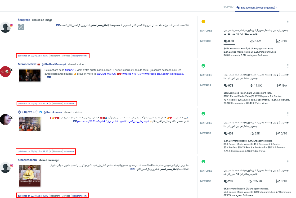 عبر أداة talkwalker استطعنا كشف سحابة الكلمات الأكثر استخداماً في دولة محددة، وعندما اخترنا المغرب، تبين أن أكثر الكلمات استخداماً وتكراراً تعكس السردية السائدة أو المنتشرة فيها؛ ما أمكننا أن نرى بوضوح استخدام وسوم؛ #المغرب_اولا و#الملك_محمد_السادس كنوع من التأييد والترويج للنظام الحاكم بالمغرب.
