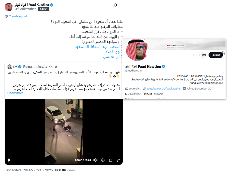 على الجانب الآخر، برز حساب يُعبّر عن رأي مخالف، وهو حساب "فؤاد كوثر"، الذي سبق أن تناولناه في تحقيق "حركة الملثمين الأحرار". ركّز الحساب على نشر أخبار الاحتجاجات نقلاً عن حسابات جزائرية ادّعت أن قوات الأمن المغربية انسحبت أو هُزمت أمام المحتجين، وهو ما دفعنا إلى التحقق من طبيعة المحتوى الذي تنشره بعض الحسابات الجزائرية حول الاحتجاجات في المغرب.