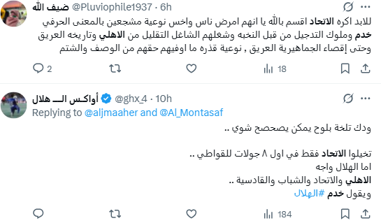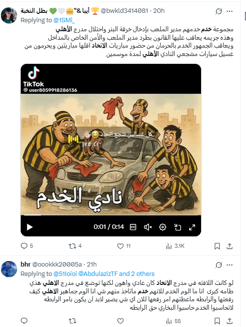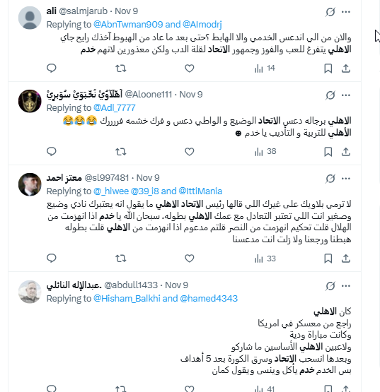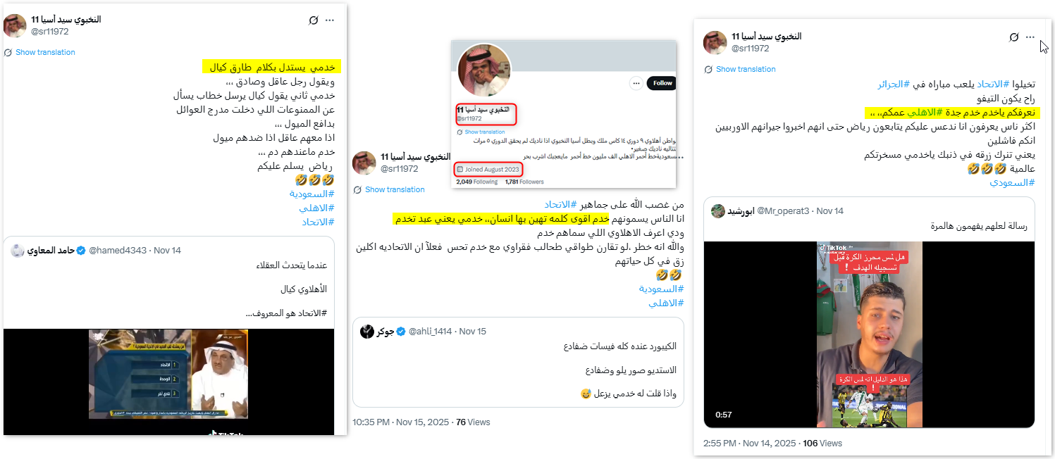 أعاد حساب "11 النخبوي سيد أسيا@sr11972" ترديد خطاب الكراهية نفسه، إذ وصف مشجعي نادي الاتحاد بالخدم وفسر سياق استخدامها؛ بقوله: "خدمي يعني عبد تخدم".