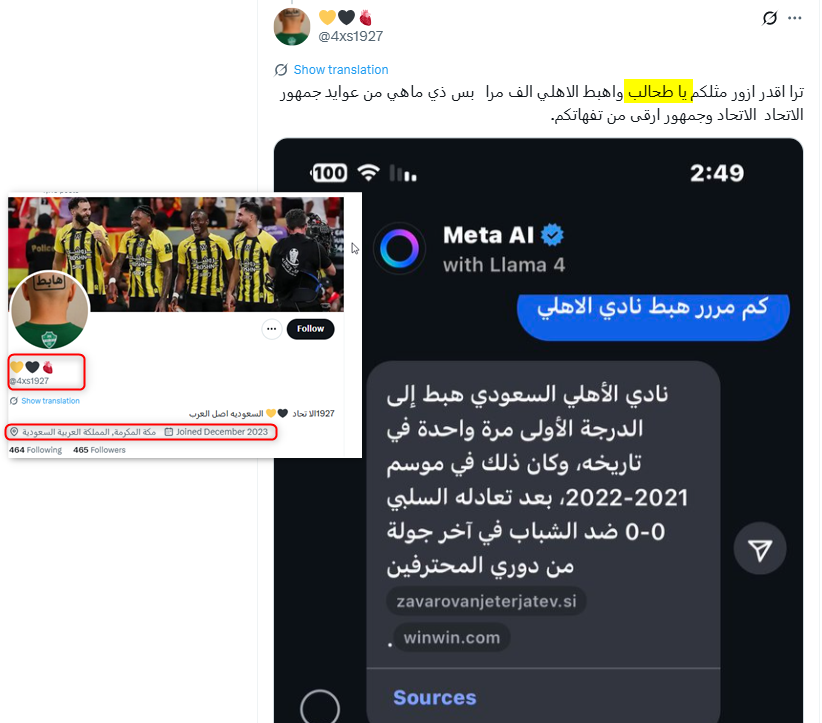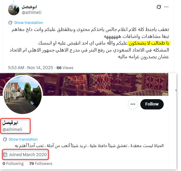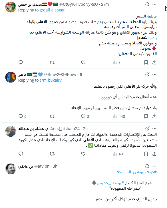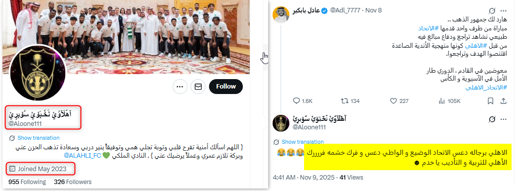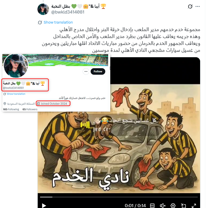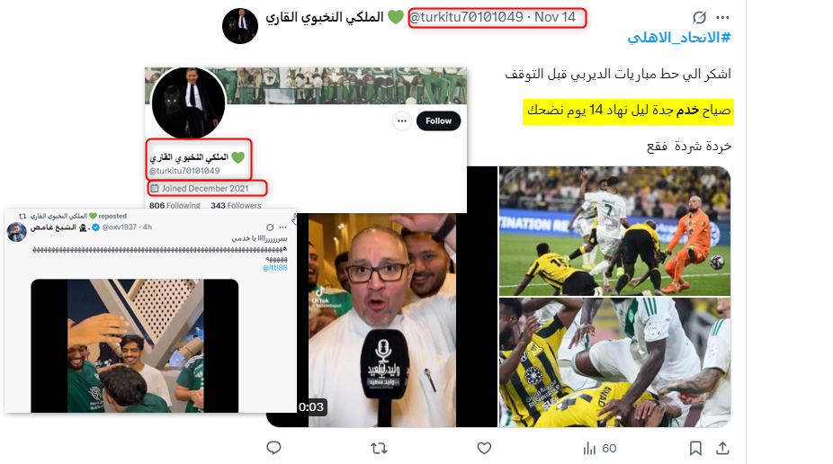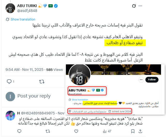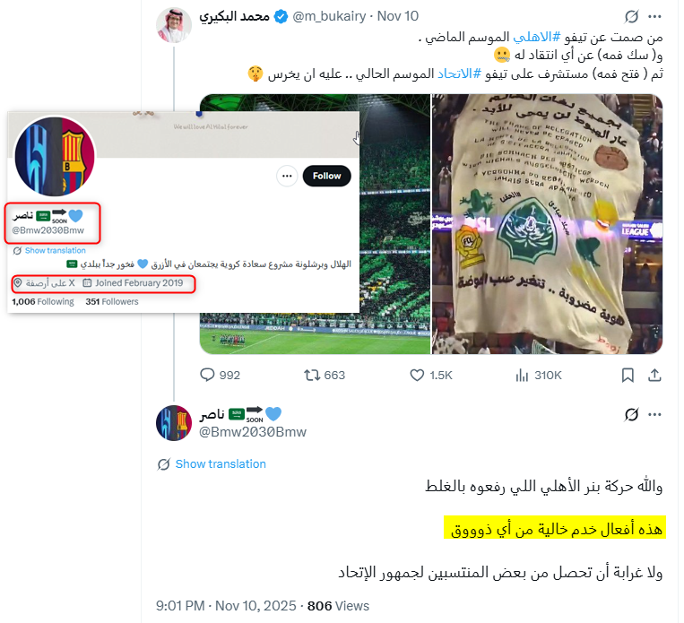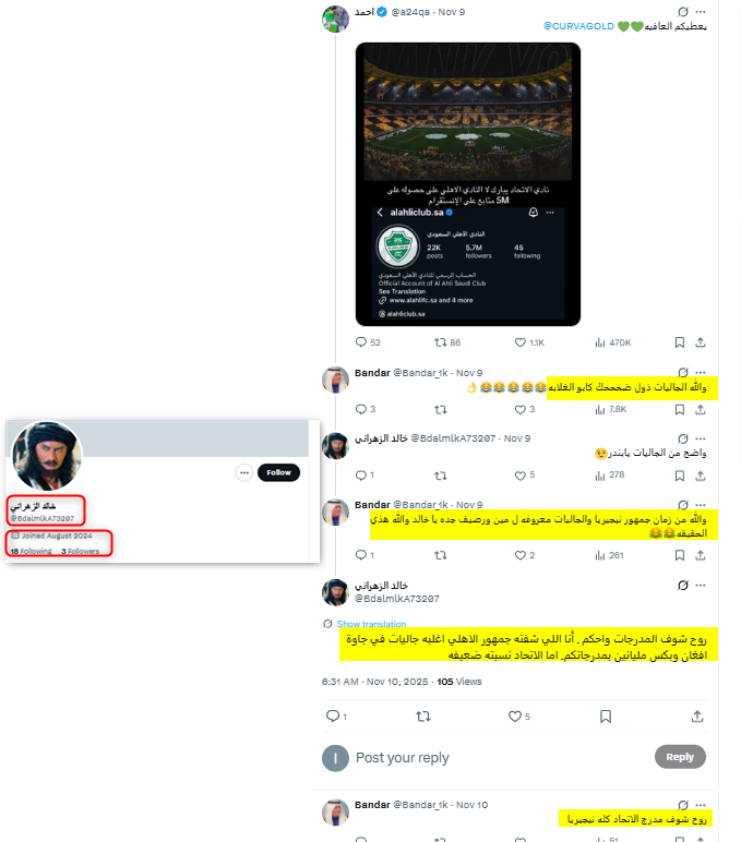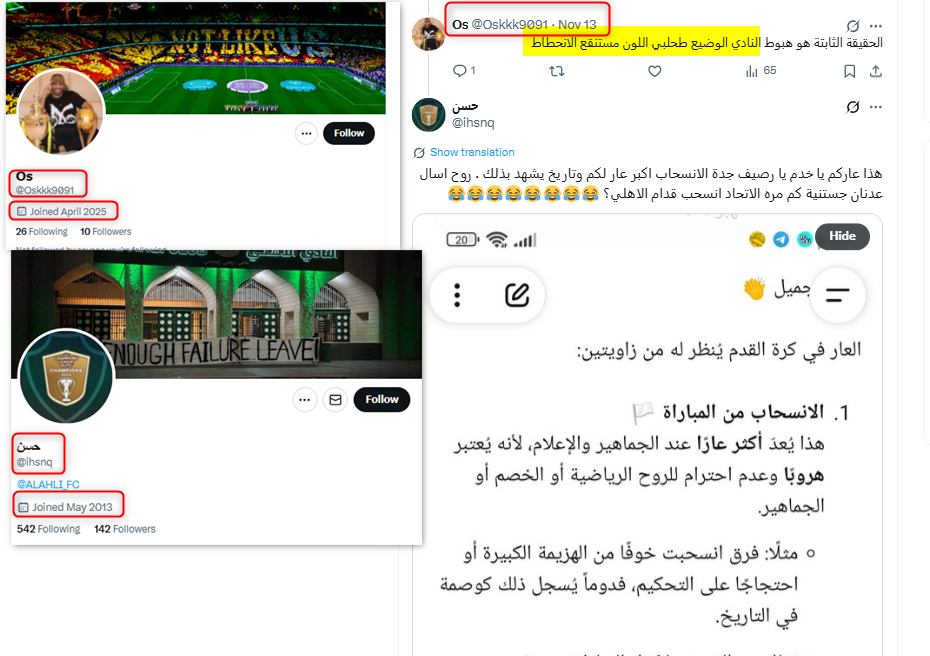 ونشطت عدة حسابات حديثة ووهمية مناصرة لنادي الاتحاد في التفاعل مع هذا الخطاب وترديده، من هذه الحسابات، حساب "OS @Oskkk9091"؛ وهو حساب حديث، يعود تاريخ نشأته إلى عام 2025.