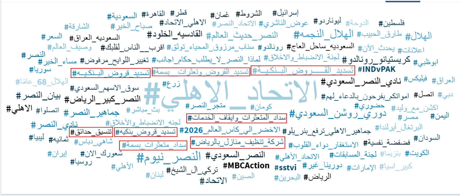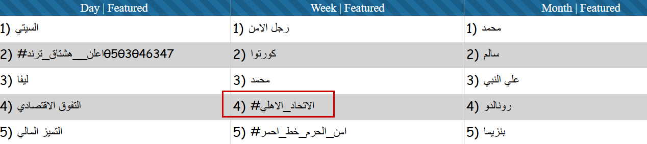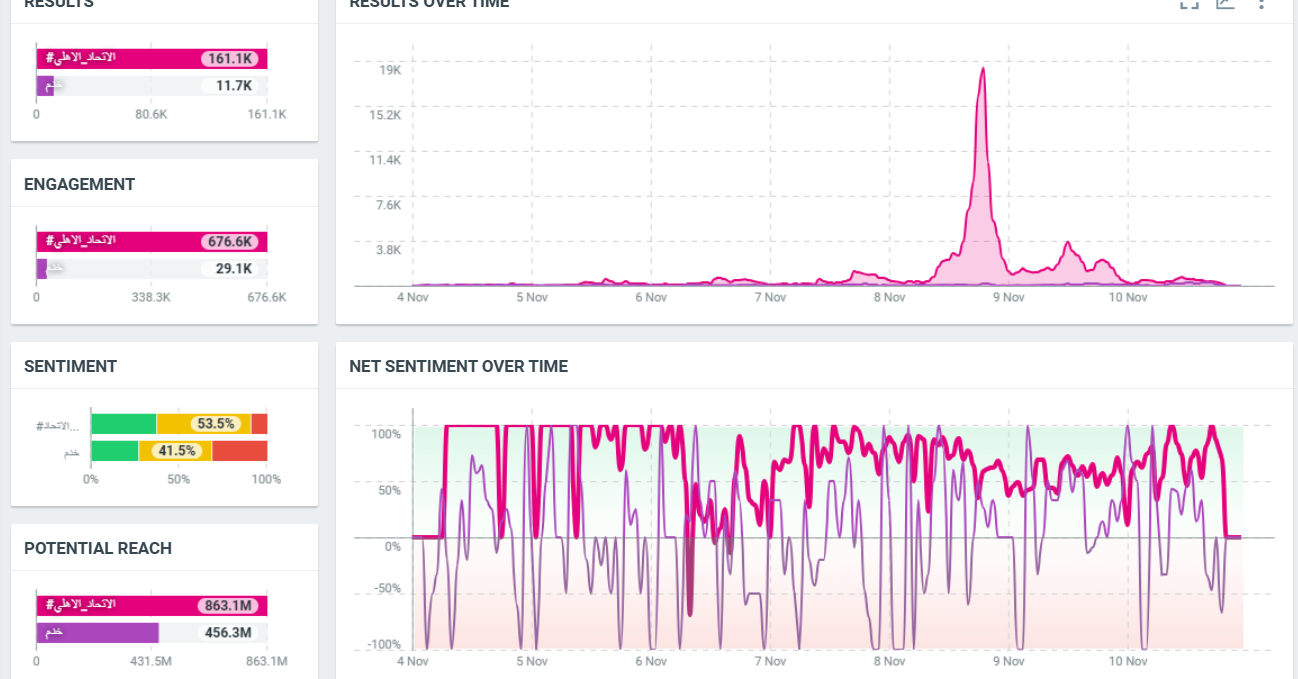 بلغ التدوين تحت وسم "#الاتحاد_الاهلي" ذروته يوم التاسع من تشرين الثاني/نوفمبر، يوم المباراة بين نادي الأهلي والاتحاد السعوديين، إذ وصل عدد المنشورات في هذا اليوم فقط، نحو 21 ألف منشور.