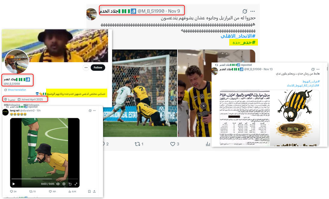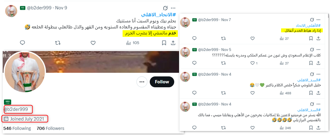 وهي السبة نفسها التي استخدمها حساب "@b2der999"، حين وصف لاعبي الاتحاد بـ"خدم ما تمشي إلا بضرب الجزم"، وهو حساب سعودي يعود تاريخ ظهوره إلى عام 2021، ولا يضع الحساب صورة شخصية حقيقية، ويتكون اسم المستخدم للحساب من حروف وأرقام عشوائية، ما يشير إلى أنه حساب غير حقيقي أو مؤتمت.