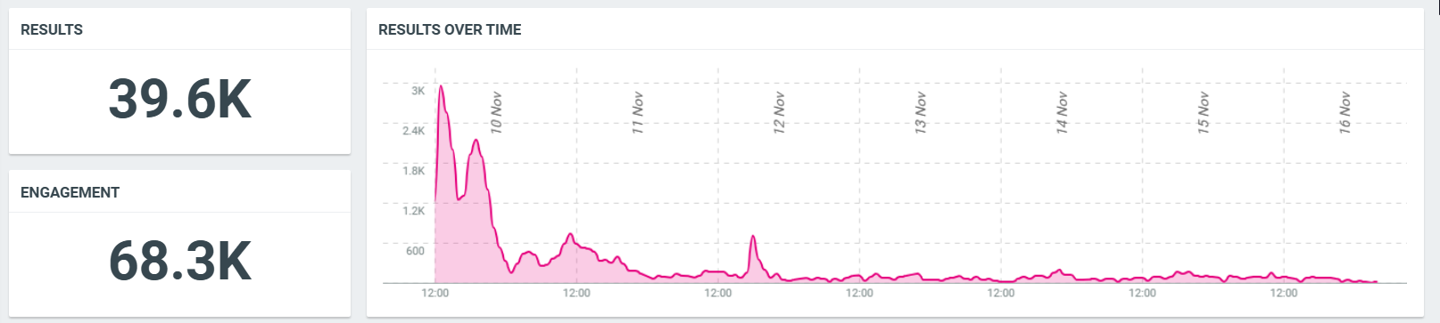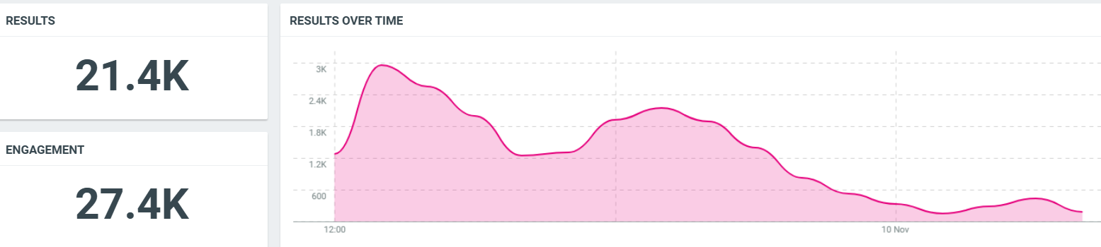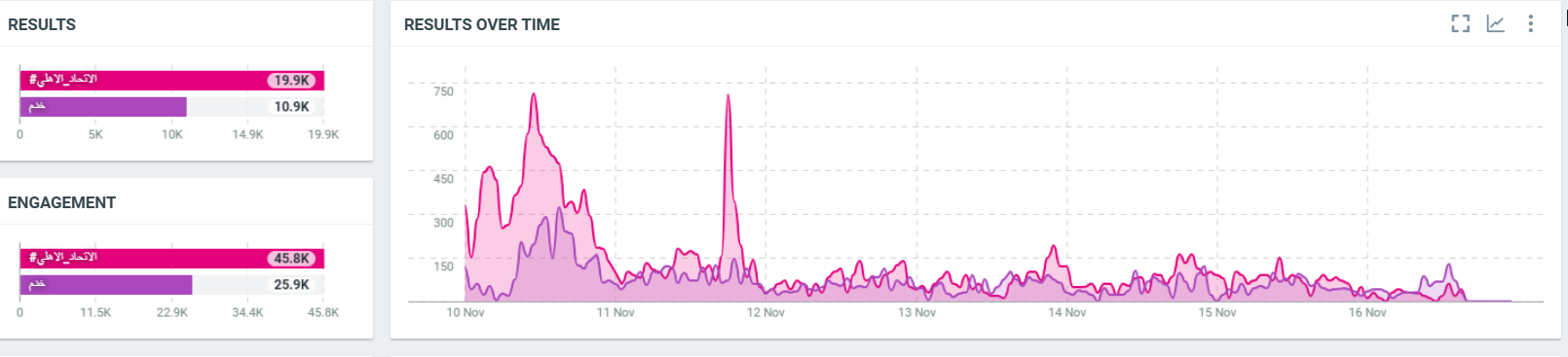 ما بين التاسع من تشرين الثاني/نوفمبر وحتى يوم 15 تشرين الثاني/نوفمبر، بلغ عدد المنشورات نحو 40 ألف منشور، حققوا تفاعلاً يقدر بنحو 68 ألف تفاعل، وإجمالي وصول يقدر بنحو 140 مليون مرة.