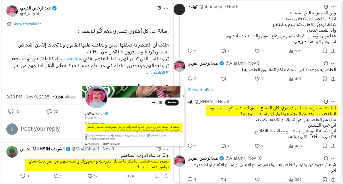 في يوم المباراة، نشر حساب الصحفي السعودي "عبدالرحمن القرني @A_algrni" على منصة "أكس" منشوراً ينتقد فيه السلوك "العنصري" للمشجعين، إلا أن قائمة التعليقات على المنشور امتلأت بالسب، ووصفته هو نفسه بالعنصرية.