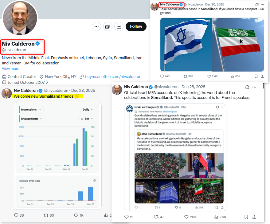 على الجهة الأخرى، نشط حساب @nivcalderon كحساب مركزي داخل الحملة، وهو حساب صحفي إسرائيلي مقيم بنيويورك، بعد إعلان إسرائيل اعترافها بأرض الصومال كجمهورية مستقلة، تفاعل Niv Calderon مع الموضوع ومع عدد من الحسابات الصومالية، كما قال بنفسه على حسابه مرحبا بتفاعل الحسابات من أرض الصومال.