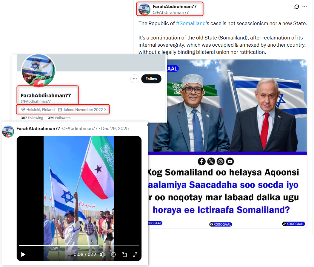 وتكررت هذه الأنماط مع حسابات أخرى منها "@FAbdirahman77"، وهو حساب صومالي، حديث النشأة يرجع تاريخ نشأته إلى عام 2022، وحدد موقعه بفنلندا، ويضع العلم الإسرائيلي في خلفية صورته الشخصية.