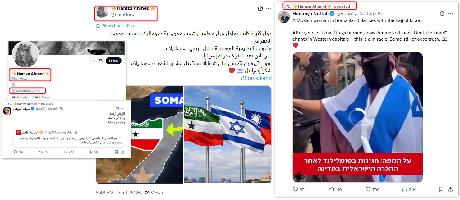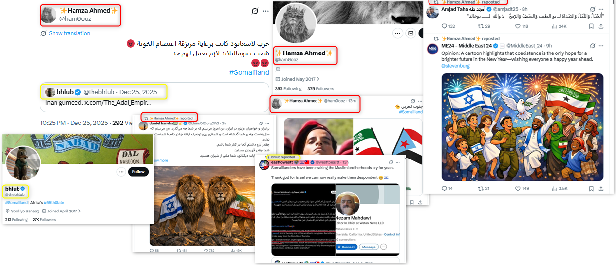 في منتصف نهار يوم 25 كانون الأول/ ديسمبر، ظهر حساب باسم ✨Hamza Ahmed✨"@ham0ooz"، وهو حساب يعود إلى 2017، لا يضع صورة شخصية حقيقية وحدد موقعه في أفريقيا، وتفاعل مع حساب الناشط الإماراتي المؤيد والداعم لإسرائيل "أمجد طه"، ونشر تغريدة تدعم انفصال جنوب اليمن بالتوزاي مع دعم انفصال أرض الصومال.