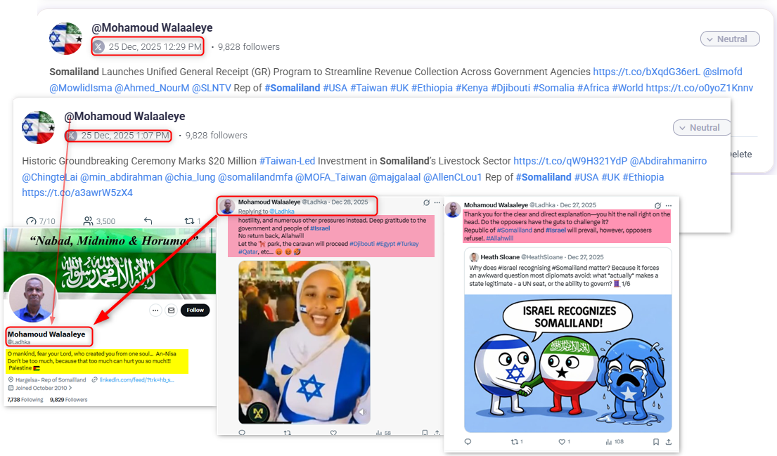من بين هذه الحسابات، حساب صومالي باسم" Mohamoud Walaaleye @Ladhka"، ظهر على أداة التحليل Brand Mention بصورة شخصية تجمع بين علمي أرض الصومال وإسرائيل، قبل أن تُحذف لاحقًا. ورغم وضعه اسم "فلسطين" في خانة التعريف، أظهرت مراجعة تفاعلاته دعماً صريحاً لإسرائيل، وامتنانًا لنتنياهو على اعترافه بأرض الصومال.