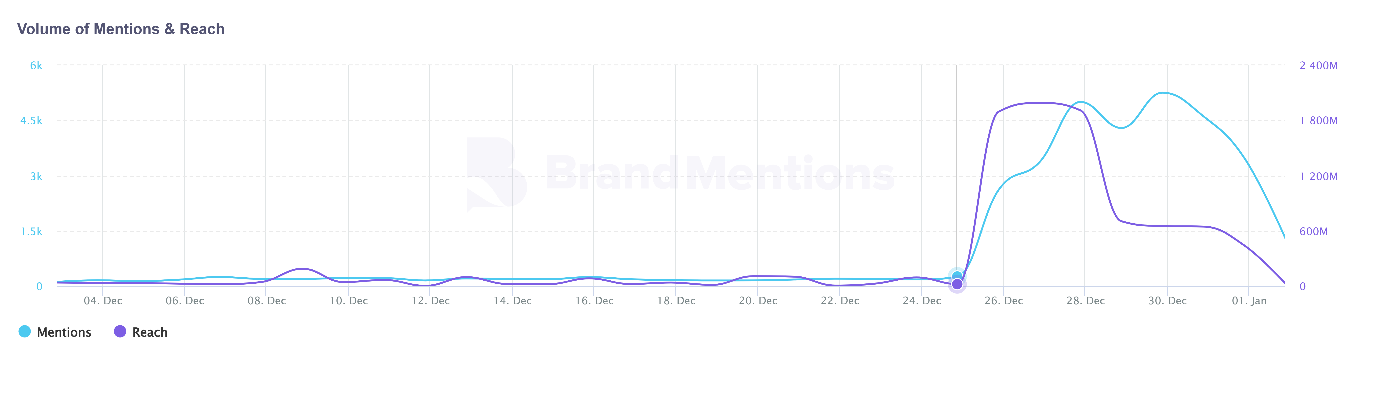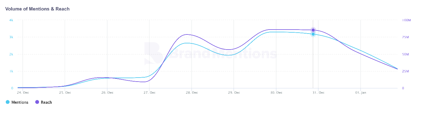 بلغت الحملة ذروتها الأولى في 28 كانون الأول/ ديسمبر، ثم بلغت ذروتها الثانية في 30 كانون الأول/ ديسمبر، حددنا منصة "إكس" بما أنها استحوذت على حوالي نصف حجم المحتوى، وقد شارك في النشر على منصة "إكس" 7339 حساب.