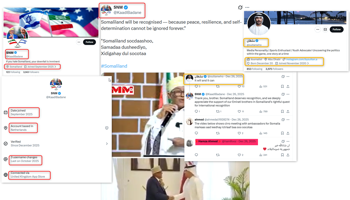 في الخامس والعشرين من كانون الأول/ ديسمبر، أي قبل يوم واحد من الإعلان الرسمي، رُصد نشاط لافت لحسابات تفاعلت مع وسمَي #Somaliland و #SomalilandRecognition خاصة على منصة "أكس".