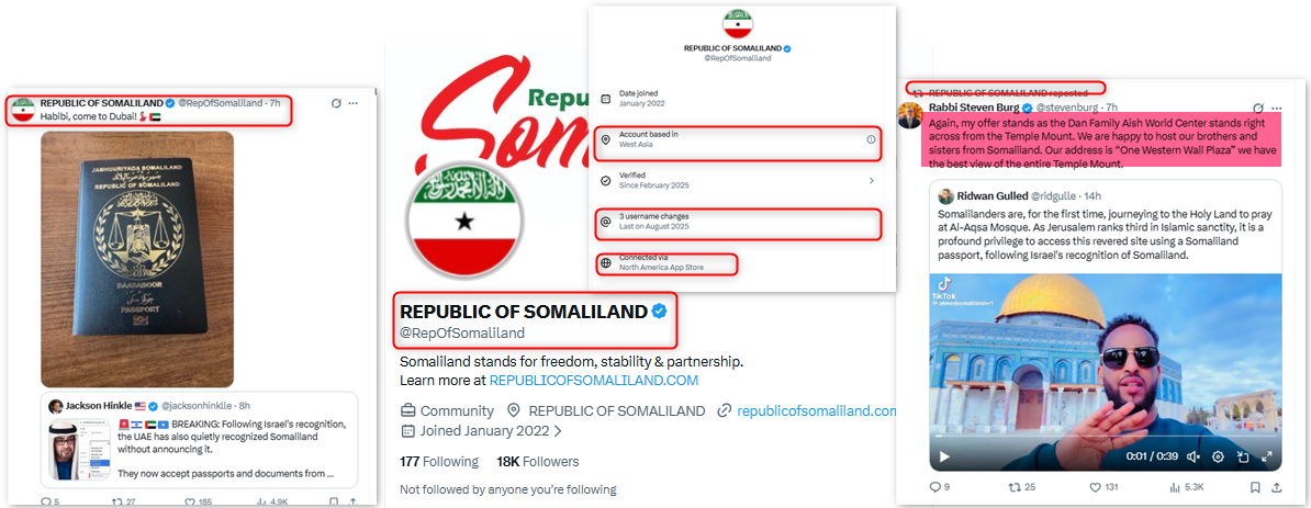 بفحص الحساب، تبين أنه ينشر تغريدات مؤيدة للإمارات وإسرائيل، كما أن خاصية الشفافية على منصة "إكس" بينت أن الحساب يُدار من شمال أمريكا وليس من أرض الصومال كما يدعي الحساب!