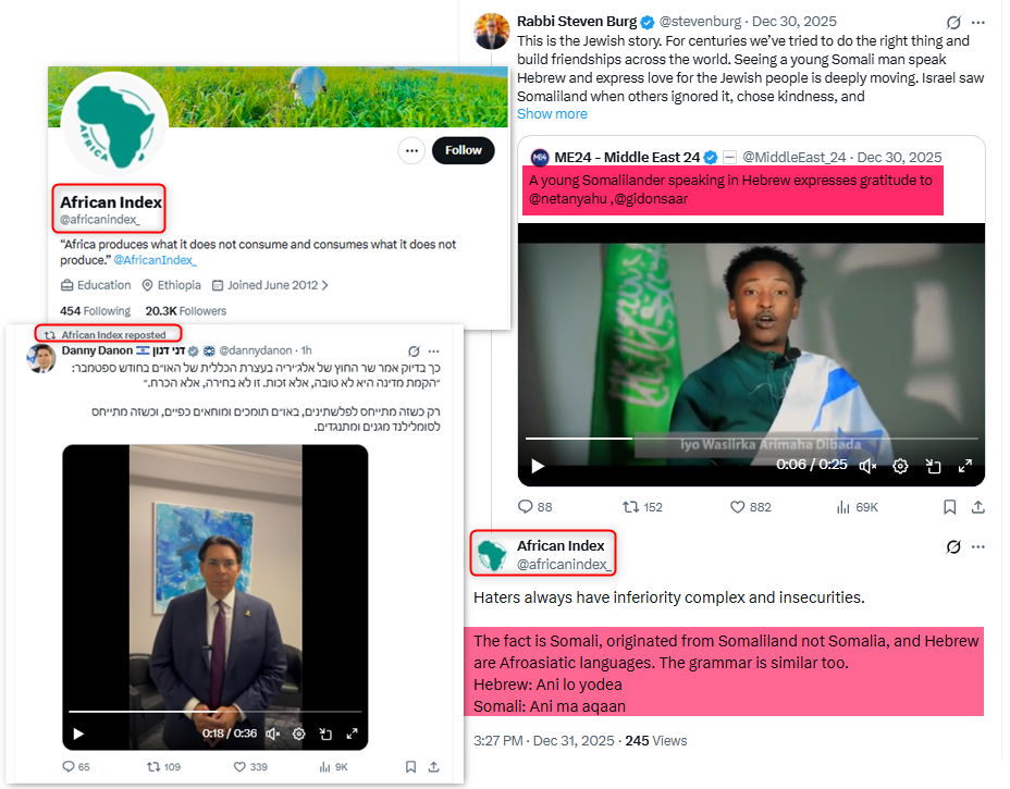 تلاهم بالقائمة، حساب يدعى "African Index @africanindex_" نشر 49 تغريدة، وهو حساب مختص بنشر ما يتعلق بأفريقيا، وقد حدد موقعه بأثيوبيا، إلا أن خاصية الشفافية بمنصة "أكس" أظهرت أن موقع الحساب في استراليا، ويتفاعل الحساب مع تغريدات لحسابات إسرائيلية، منها حساب إسرائيلي نشر مقطع مصور قال إنه لشاب من أرض الصومال يتكلم العبرية ويشكر إسرائيل ونتنياهو على موقفهم من أرض الصومال.