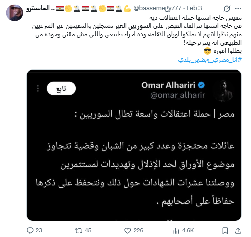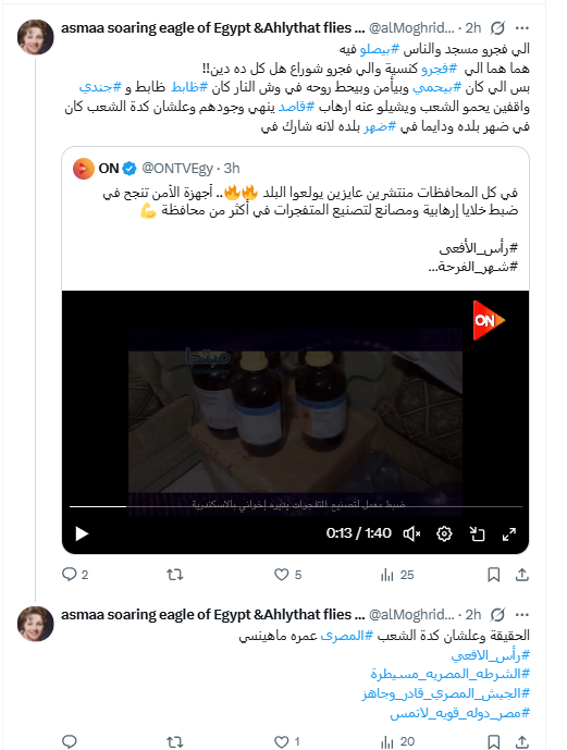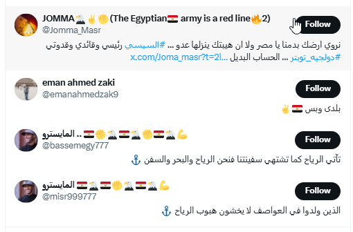 كما نشر حساب «المايسترو» @bassemegy777، وهو حساب حديث لا يستخدم هوية واضحة، 13 منشوراً تضمّنت الوسم ذاته، وتبيّن تفاعله مع شبكة الحسابات نفسها التي تضم الحساب @Jomma_Masr.