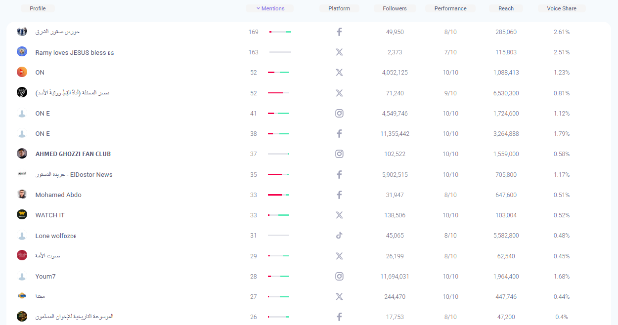 تصدر حساب "حورس صقور الشرق" الذي يُعرف نفسه بأنه "تابع للمخابرات العامة المصرية" قائمة الحسابات الأكثر تفاعلاً مع الحملة، إذ نشر 169 منشوراً عبر منصة "فيسبوك" خلال الأسابيع الماضية.