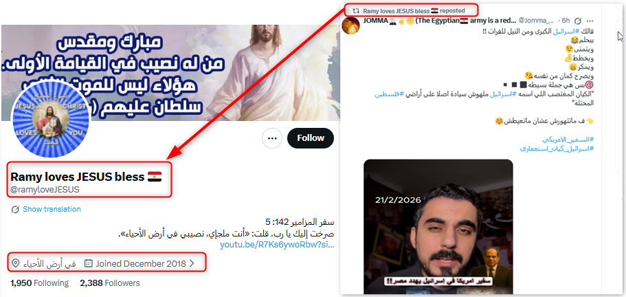 يُظهر فحص حساب "@ramyloveJESUS" أنه حديث الإنشاء نسبياً، ولا يستخدم صورة شخصية أو اسماً حقيقياً، كما أن غالبية منشوراته (163 منشوراً) جاءت في صورة تعليقات مرتبطة بوسم #رأس_الأفعى، ما قد يشير إلى استخدامه لأغراض تضخيم التفاعل.