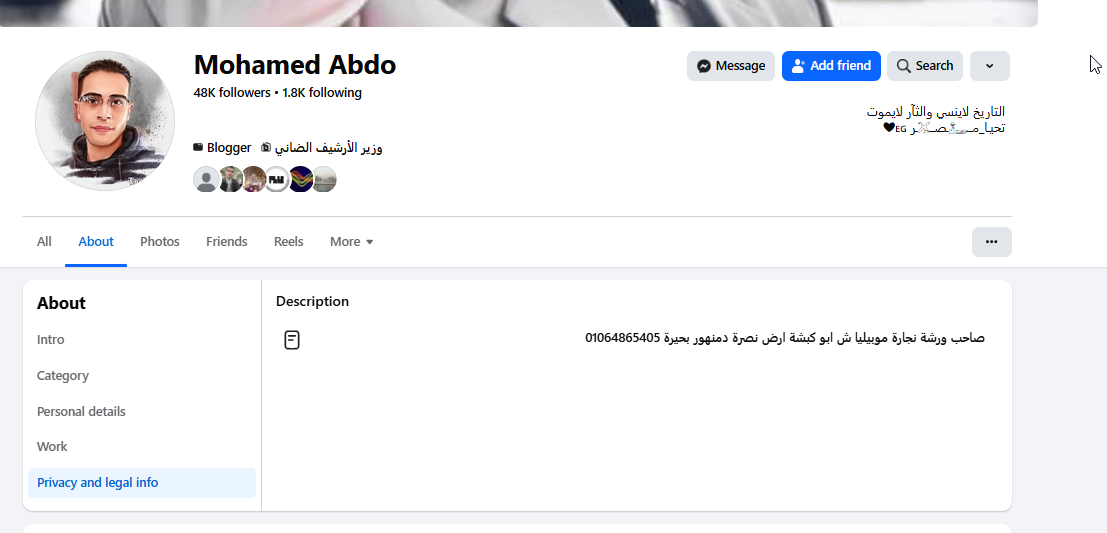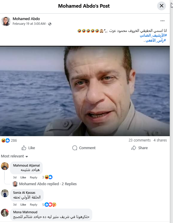 بعد ذلك ، ظهر حساب آخر يدعى @mohamed.abdo.93662 ضمن الحسابات المتفاعلة، نشر 33 منشورًا عبر منصة «فيسبوك» تضمّنت وسم #رأس_الأفعى، ويشير وصف الحساب إلى أنه صاحب ورشة نجارة في مدينة دمنهور بمحافظة البحيرة.