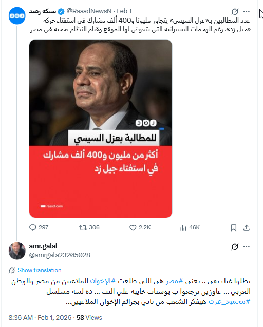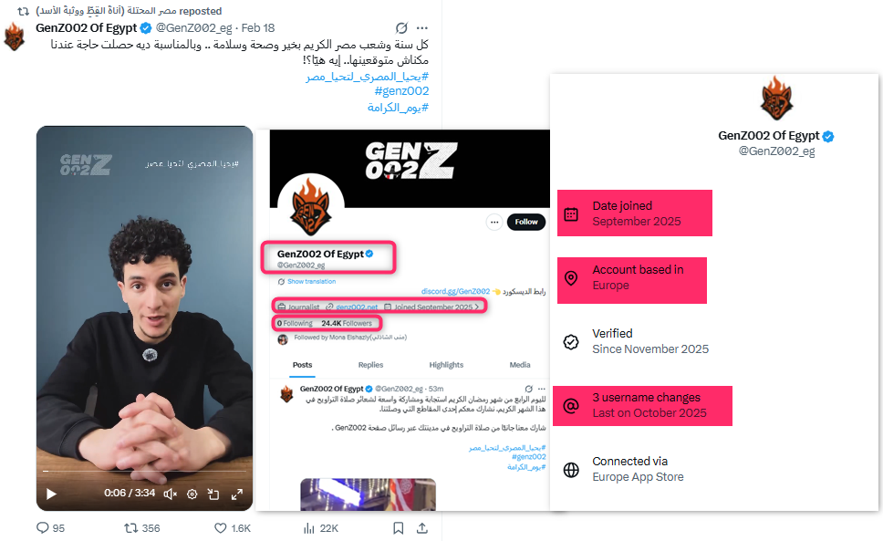 كما تفاعل الحساب مع حساب "@GenZ002_eg" الذي أُنشئ عام 2025، ولا يستخدم صورة شخصية، ويرتبط بالنطاق ذاته، وقد أظهرت خاصية الشفافية أنه غيّر اسمه ثلاث مرات، ويُحدَّد موقعه الجغرافي في أوروبا.
