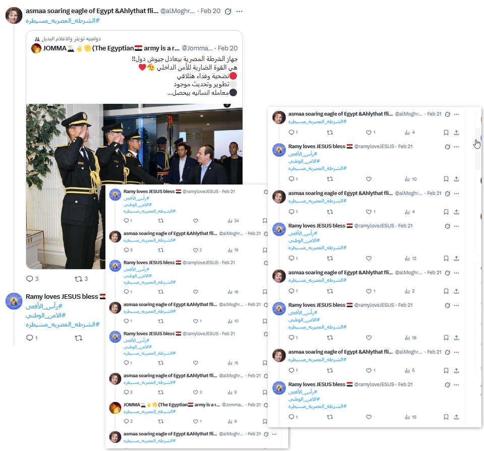 وجاء بعده حساب يحمل اسم المستخدم "@ramyloveJESUS"، الذي نشر 14 تعليقاً خلال فواصل زمنية قصيرة على منشور لحساب آخر يدعى " @alMoghridaX" تضمّنت إعادة نشر تغريدة لحساب ثالث هو @Jomma_Masr، استخدم فيها وسم #الشرطة_المصرية_مسيطرة. واقتصرت تعليقات الحساب الأول على استخدام الوسوم #رأس_الأفعى و#الأمن_الوطني و#الشرطة_المصرية_مسيطرة.