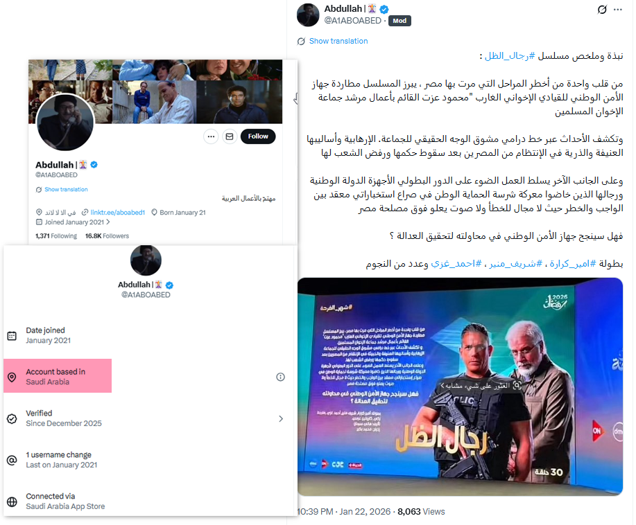 في 24 كانون الثاني/ يناير، وقبل أيام من الاحتفال بعيد الشرطة وذكرى ثورة 25 كانون الثاني/ يناير، نشر حساب يُدعى «حورس صقور الشرق» أكثر من 30 منشوراً تضمّنت ترويجاً للنظام السياسي في مصر وانتقادات لجماعة الإخوان المسلمين وفترة حكمها، مستخدماً وسم #رجال_الظل.