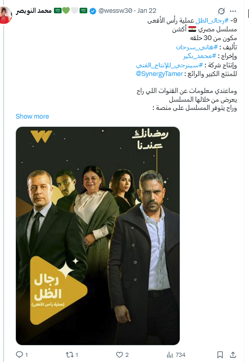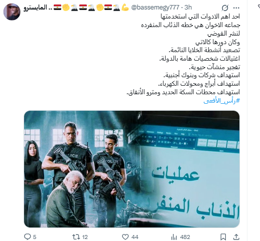 كما برز حساب «المايسترو» @bassemegy777 ضمن الحسابات النشطة التي استخدمت محتوى المسلسل في سياق سياسي.