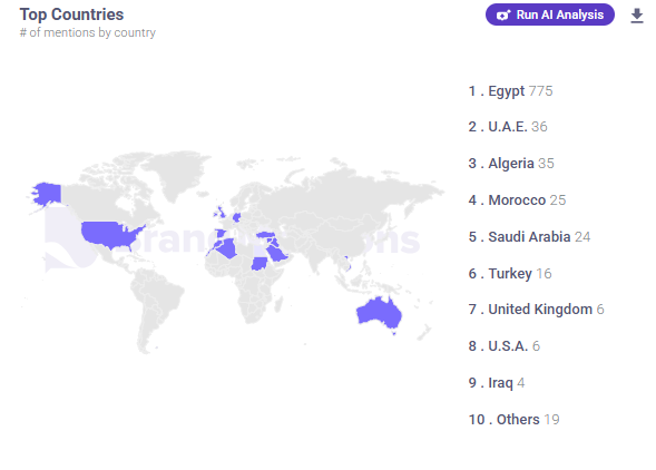 جغرافياً، سُجّل أكبر عدد من المنشورات في مصر، تلتها الإمارات بفارق ملحوظ، ثم الجزائر والمغرب والسعودية وتركيا بنسب متقاربة، تلتها المملكة المتحدة والولايات المتحدة والعراق بأعداد أقل.