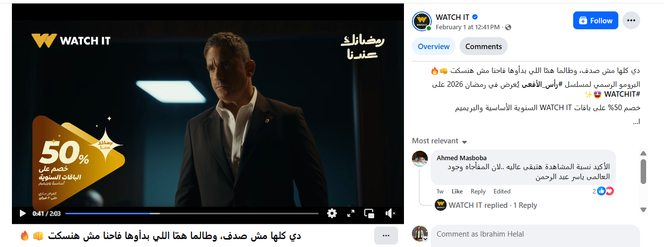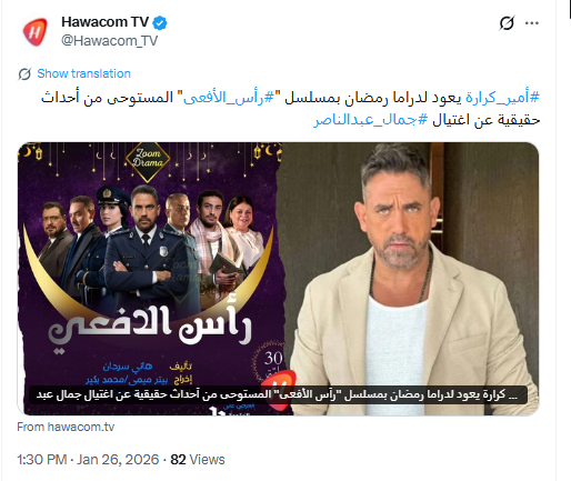 في 1 شباط/ فبراير 2026، بثت منصة WATCH IT المقطع الترويجي الأول لمسلسل "رأس الأفعى" الذي يعيد سرد واقعة مطاردة والقبض على "محمود عزت" القيادي في جماعة الإخوان المسلمين في مصر، وعضو مكتب الإرشاد، الذي تولى منصب القائم بأعمال المرشد العام عقب القبض على المرشد العام محمد بديع. وقد ارتبط اسمه بإدارة النشاط التنظيمي للجماعة داخل مصر وخارجها، وظلّ متواريًا لسنوات إلى أن أُلقي القبض عليه في القاهرة الجديدة في آب/ أغسطس 2020 بعد عملية أمنية استمرت سنوات، وهي الواقعة التي يستند إليها المسلسل، المعروف أيضاً باسم "رجال الظل: عملية رأس الأفعى"، في تجسيد أحداث المطاردة والاعتقال.