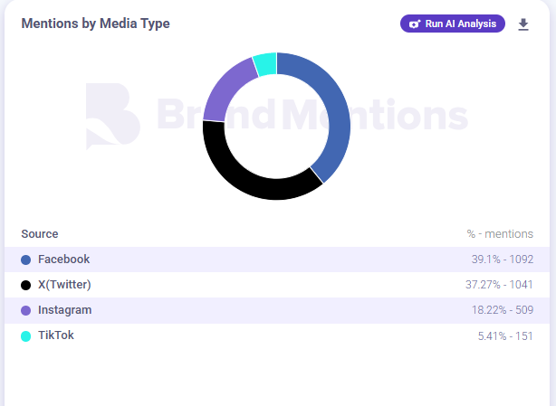 استحوذت منصة "فيسبوك" على النسبة الأكبر من المنشورات، بنحو 39% من الإجمالي، تلتها منصة «إكس» بنسبة تقارب 37% ثم « انستغرام» بنحو 18%، وأخيراً «تيك توك» بنسبة تقارب 5.5%.