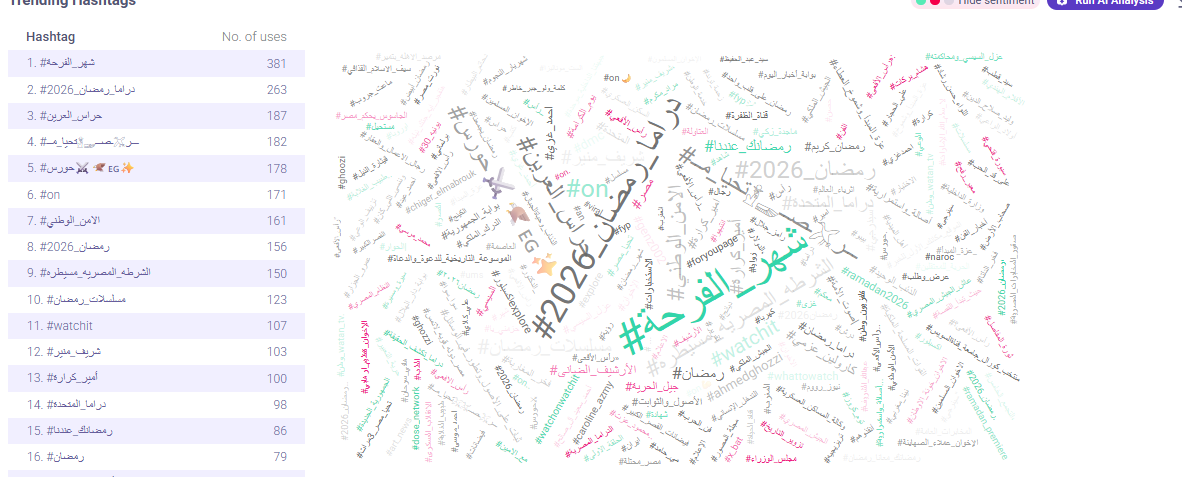 كما انعكس هذا التنوّع في الكلمات الأكثر تداولًا ضمن النقاشات المرتبطة بالوسمين؛ إذ برز اسم «رأس الأفعى» بوصفه الأكثر استخداماً، تلاه اسم «محمود عزّت»، إلى جانب كلمات مثل «الأمن الوطني» و«الشرطة المصرية».