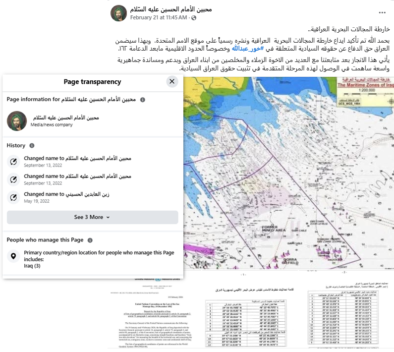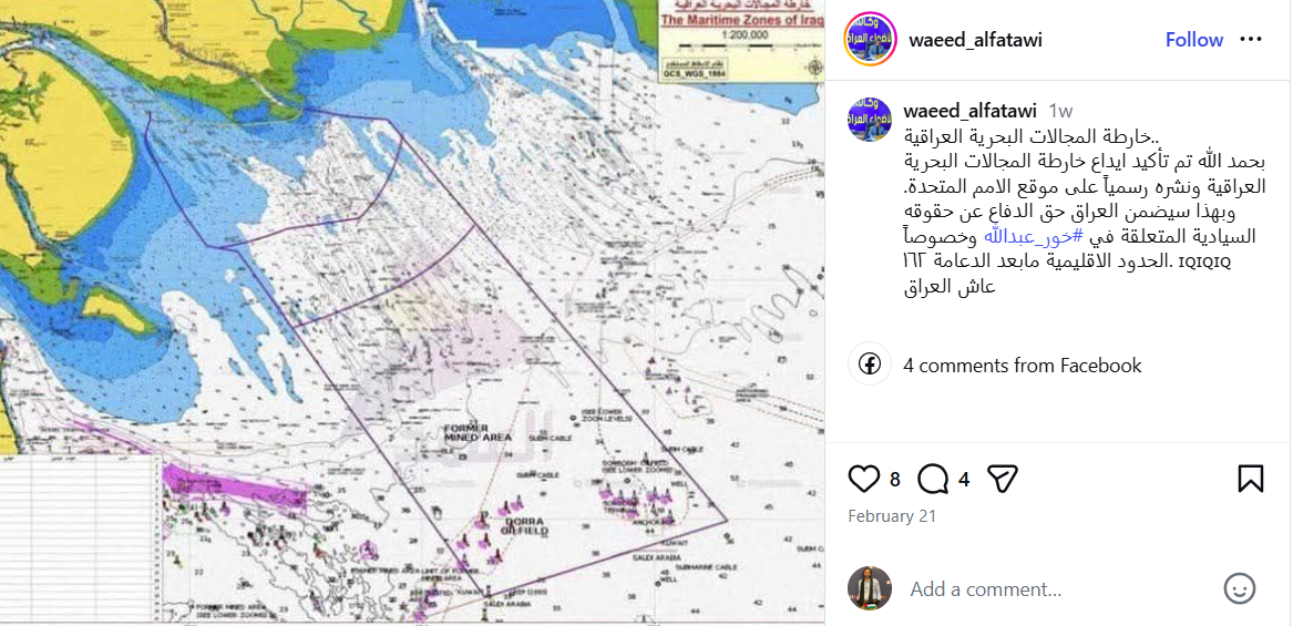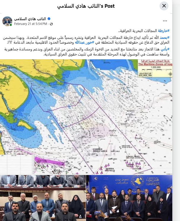 خريطة المجال البحري العراقي المقدَّمة إلى الأمم المتحدة، وتتضمن جزءاً من خليج خور عبد الله، مع صياغة منشورات متطابقة مع ما نشره النائب حيدر السلامي.