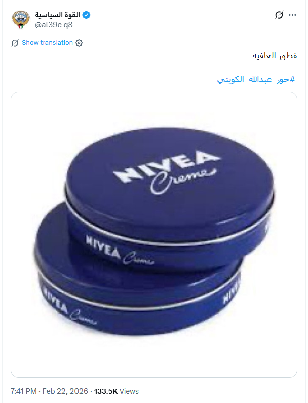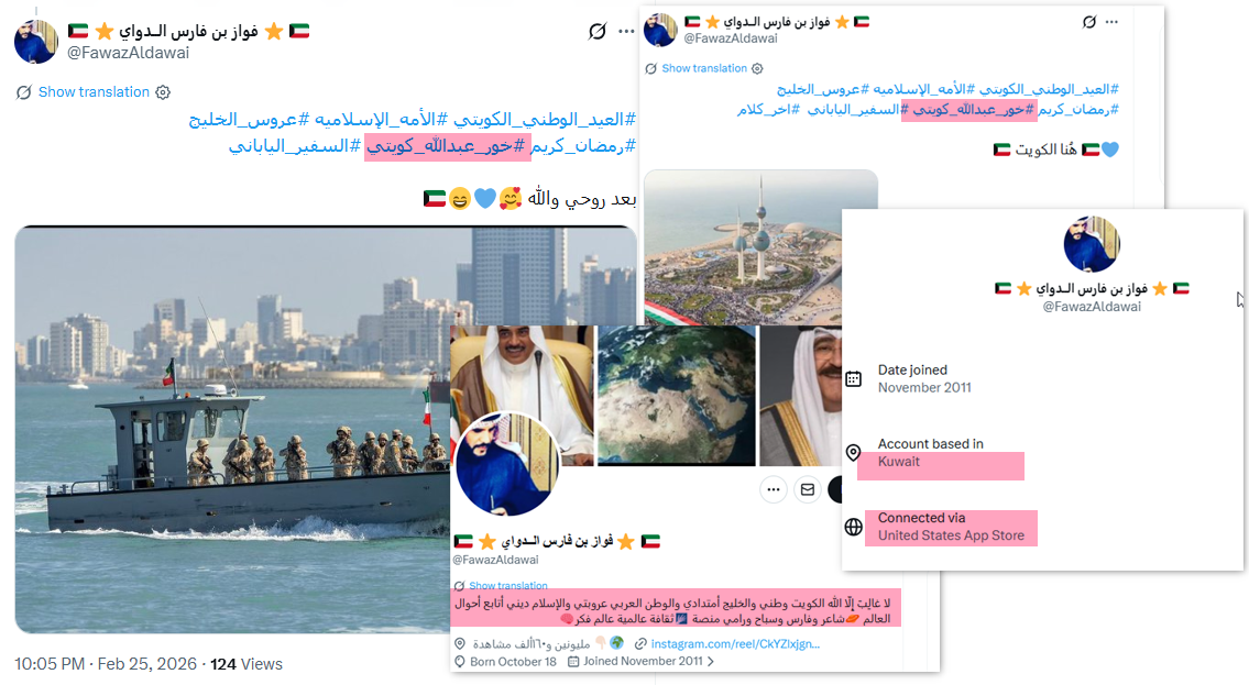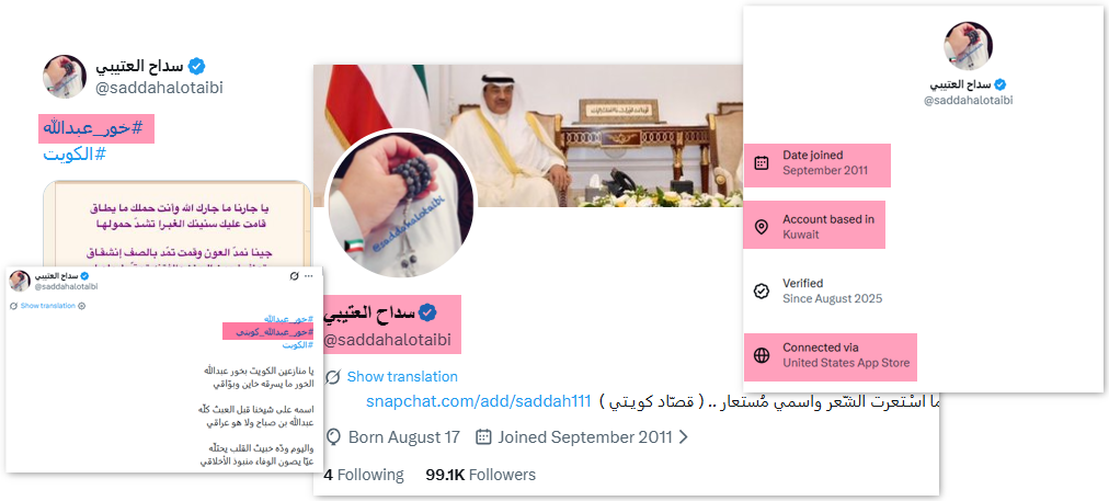 الحساب كويتي ينشط من الكويت، إلا أن الاتصال بمنصة "إكس" تم من الولايات المتحدة، ولا يستخدم صورة شخصية أو اسماً حقيقياً.