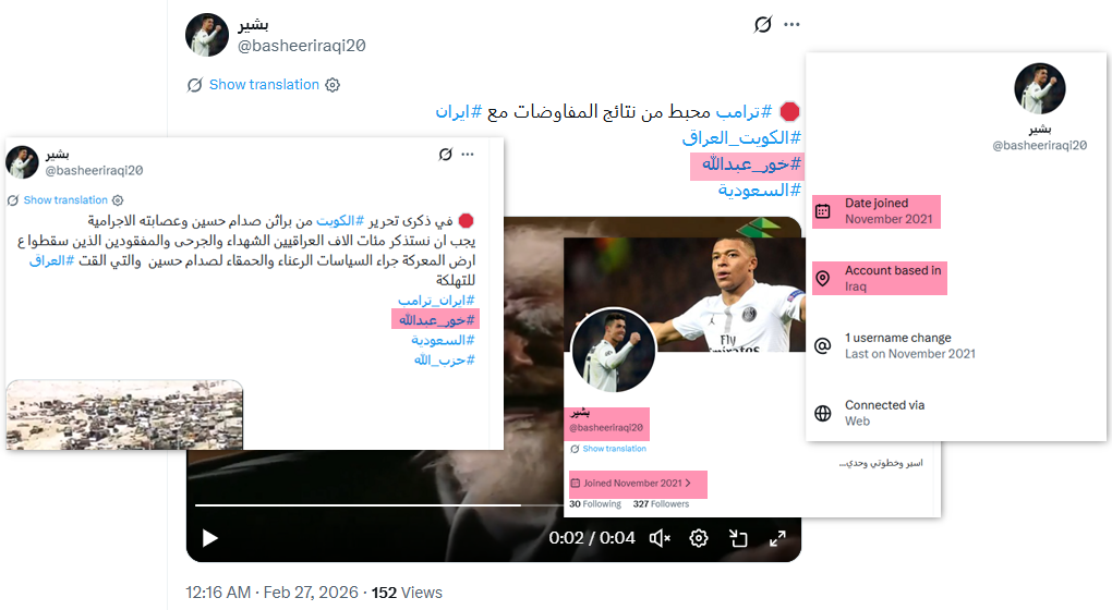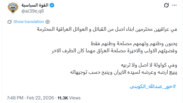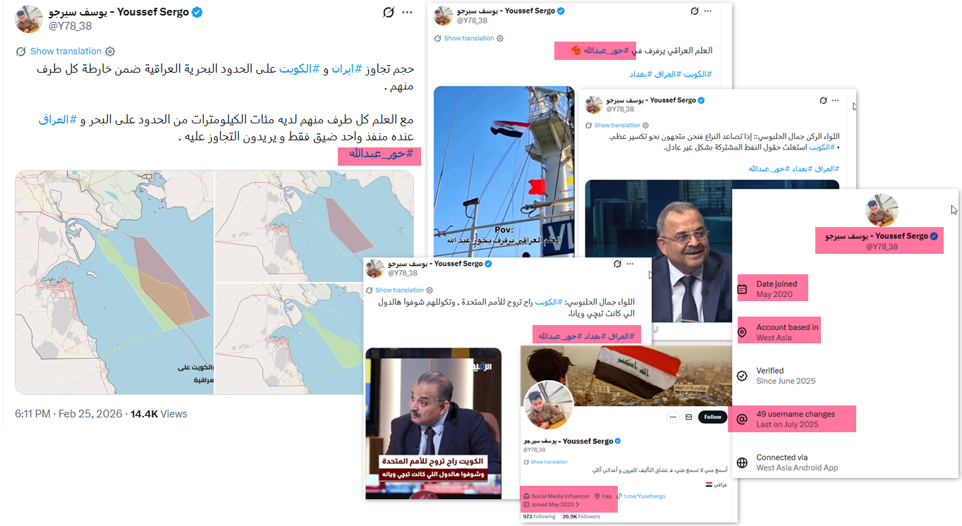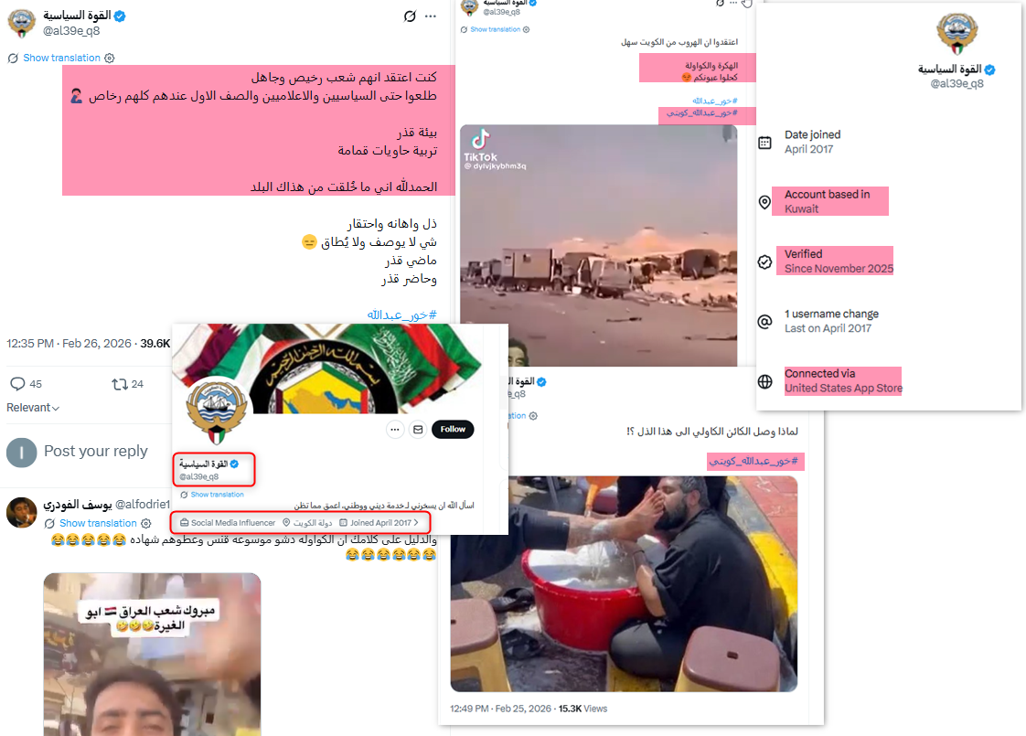 نشر 28 تغريدة مرتبطة بوسم #خور_عبدالله_كويتي، تضمنت خطاباً تحريضياً وسباً للعراق والشعب العراقي. الحساب كويتي غير شخصي، أنشئ عام 2017، واسم المستخدم يتكون من حروف وأرقام عشوائية، ويظهر الاتصال بمنصة "إكس" من الولايات المتحدة.