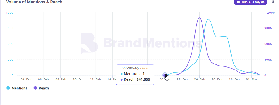 رسم بياني يوضح تصاعد النشاط المرتبط بالوسوم منذ 21 شباط، وصولاً إلى ذروته في 25 شباط.