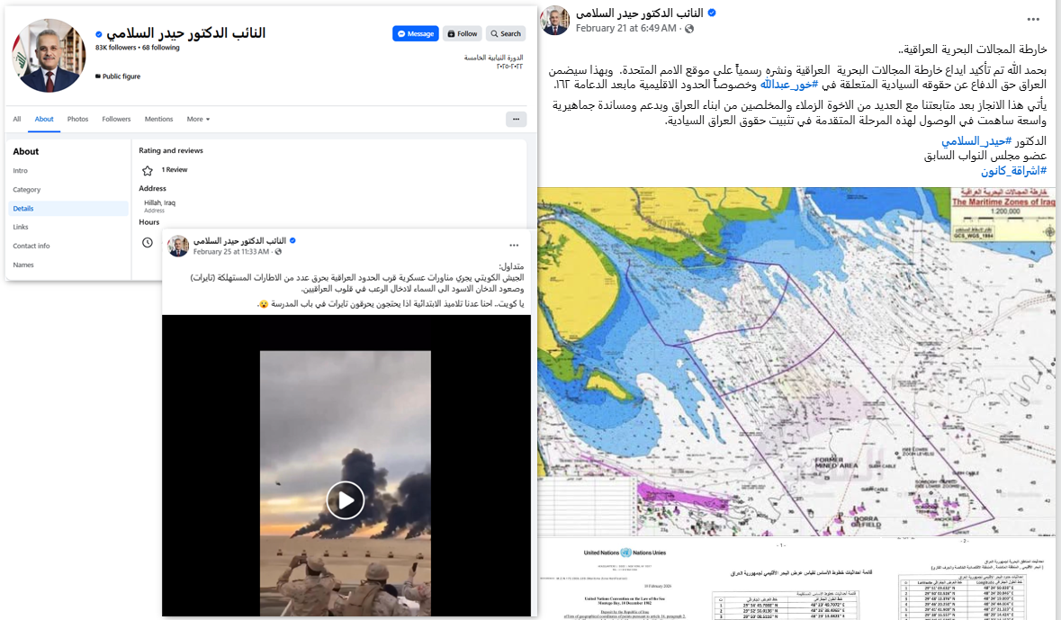 في صباح 21 شباط، نشر حساب يعود إلى النائب الدكتور حيدر السلامي منشوراً حول إيداع العراق خرائط تتعلق بخور عبد الله لدى الأمم المتحدة، وفي منشور آخر سخر الحساب من مقطع يُظهر مناورات للجيش الكويتي على الحدود العراقية.