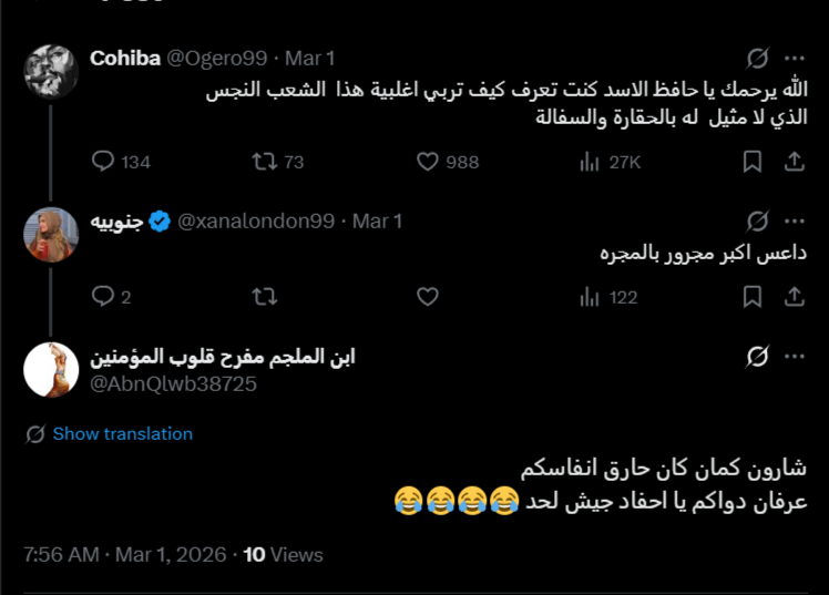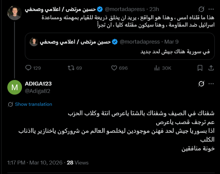 وعند توسيع النظر إلى كامل التصدير، تظهر مؤشرات على أن العداء اللفظي تجاه حزب الله سبق الموجة الأساسية إذ ظهر منذ 26 شباط/ فبراير، كما ظهرت عبارة “جيش لحد” ووسمها قبل 1 آذار/ مارس أيضًا. ويشير ذلك إلى أن ما حدث بعد هذا التاريخ لم يبدأ من فراغ؛ بل استند إلى قوالب لغوية وخطابية كانت موجودة مسبقاً، قبل أن تتكثف مع تصاعد الأحداث.