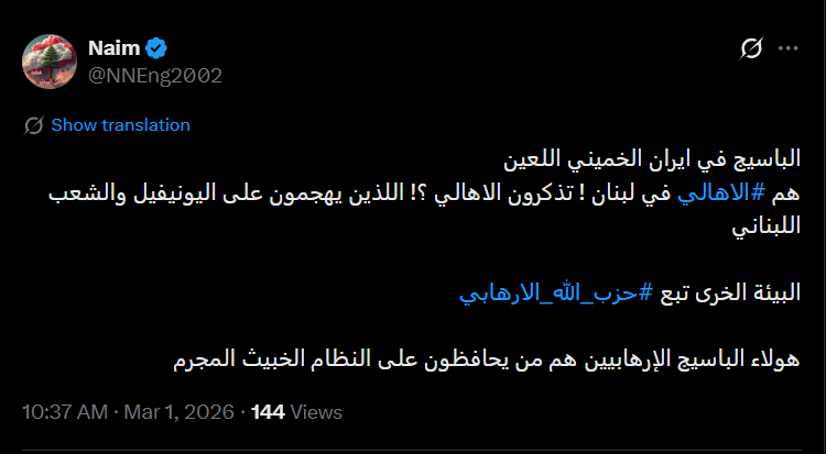 وفي عنقود تجريم حزب الله، كان الأعلى حجماً الحساب @NNEng2002 بـ42 منشوراً، و@1fahd_h و@enzo_tarek بـ 34 منشوراً لكل منهما، ثم @farass014 بـ30 منشوراً، و@DarineSuccar7 بـ 26 منشوراً.