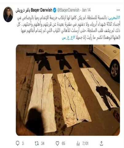 عادت قضية إعدام البحرين ثلاثة من مواطنيها الشيعة، إلى فضاء “تويتر” في الذكرى السادسة لإعدامهم في 15 كانون الثاني/ يناير 2017، فيما نشطت شبكة حسابات وهمية للتعبير عن دعمها إعدام المدانين في قتل ثلاثة شرطيين، أحدهم إماراتي الجنسية، في هجوم بعبوة متفجرة، في آذار/ مارس 2014.