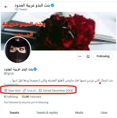 الحسابات السابقة بعضها كان سعودياً، ويضع صورة ولي العهد السعودي الأمير محمد بن سلمان، مثل fhdbnsln9@. والبعض الآخر استخدم خدمة “تويتر بلو” ودفع مقابلها للحصول على العلامة الزرقاء، مثل حساب “بنت البدو عربية الجدود – tlgrok@”، الذي كان يضع رابط وكالة الأنباء البحرينية الرسمية، ومثلها فعل حساب haniii31@.