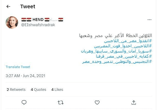 كان لافتاً أيضاً أن هند أعطت حسابها EIshwafshradrak@ بعض الراحة، فلم تكن له مساهمات في الهاشتاغ #ضد_توطين_وتجنيس_اللاجيين، بينما كانت نشطة من خلال حسابها Egyptianhiklxzp@.