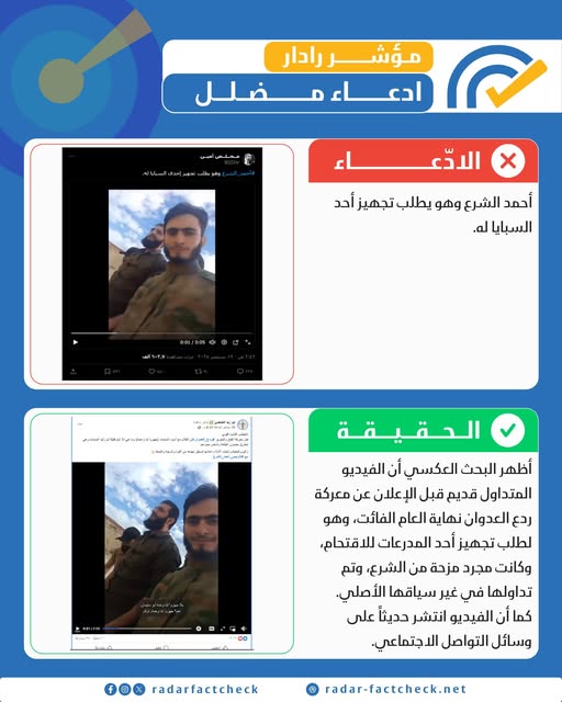 منصتا "رادار"و "ترو بلاتفورم" تحققتا من الفيديو، وتبين أنه صُوّر في منطقة غير سكنية قرب إحدى جبهات القتال. البحث العكسي أظهر أن المقطع قديم ويعود إلى أيلول/ سبتمبر 2024، قبل الإعلان عن معركة "ردع العدوان".