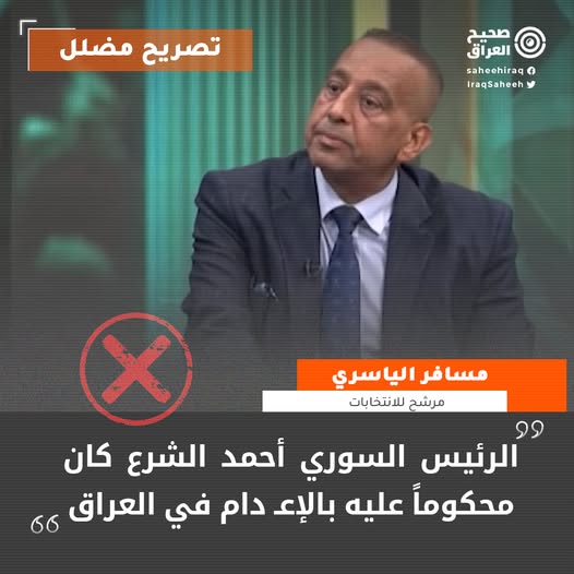 مسافر الياسري، مرشح الانتخابات العراقية، قال إن «الرئيس السوري أحمد الشرع كان محكوماً عليه بالإعدام في العراق».