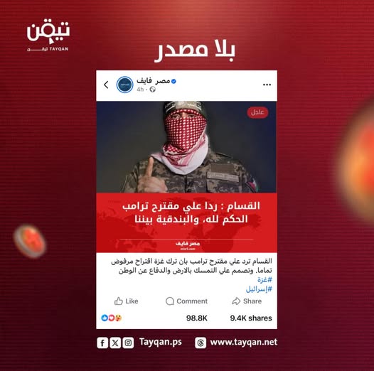 منصة «تيقن» الفلسطينية المتخصصة في تدقيق المعلومات، أوضحت أن التصريح بلا مصدر، إذ لم يُنشر عبر أي من القنوات أو المواقع الرسمية التابعة للحركة أو الكتائب، كما لم تتناقله أي وسيلة إعلامية معروفة. وتزامن انتشار الادعاء مع كشف ترامب عن خطته لإنهاء الحرب، والتي ردّت حماس عليها ورحّب ترامب بردّها وانطلقت في القاهرة الآن مفاوضات لوضع الخطوط الأساسية لتنفيذها.