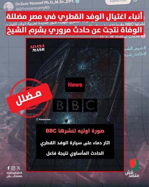 مازلنا في مصر؛ حيث تداول مستخدمون على منصة «إكس» منشوراً زعم "اغتيال" الوفد القطري أثناء توجهه إلى شرم الشيخ للمشاركة في قمة وقف الحرب على غزة، ونُسبت الصور المرافقة للادعاء إلى «بي بي سي»، بدعوى أنها تُظهر سيارة الوفد وعليها آثار دماء ورصاص.