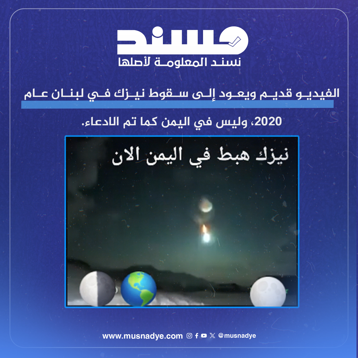 منصة «مُسند» أوضحت أن الفيديو مضلل، ويعود إلى حادثة سقوط نيزك في منطقة «جبل صنين» بلبنان، التُقط بتاريخ 24 كانون الثاني/ يناير 2020، ولا علاقة له بأي ظواهر حديثة في اليمن.