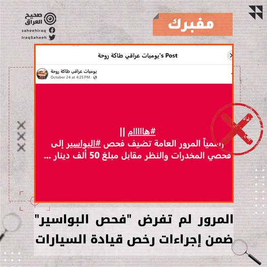 تداولت صفحات عراقية خبراً يزعم أن "المرور العامة أضافت فحص البواسير إلى فحص المخدرات والنظر مقابل 50 ألف دينار"، ما أثار موجة من التعليقات الساخرة على مواقع التواصل.
