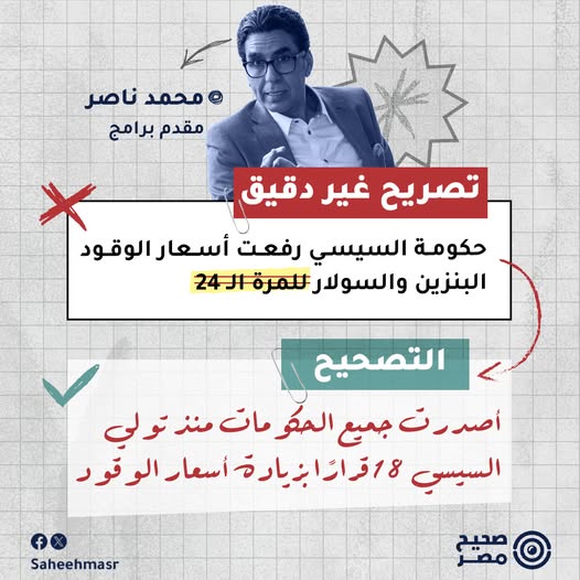 «صحيح مصر» تحققت من صحة الادعاء وراجعت القرارات الرسمية، وتبين أن التصريح غير دقيق: منذ تولي الرئيس عبد الفتاح السيسي في يونيو 2014 صدرت 18 قراراً بزيادة أسعار الوقود فقط، إلى جانب 4 قرارات بتثبيت الأسعار وقرارين بخفضها.